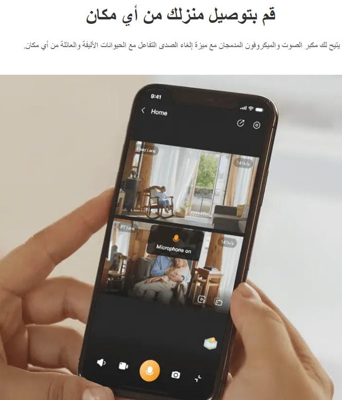 - كاميرا مراقبة مزودة بصوت ثنائي الاتجاه للتواصل المباشر من خلال التطبيق مع من في المكان